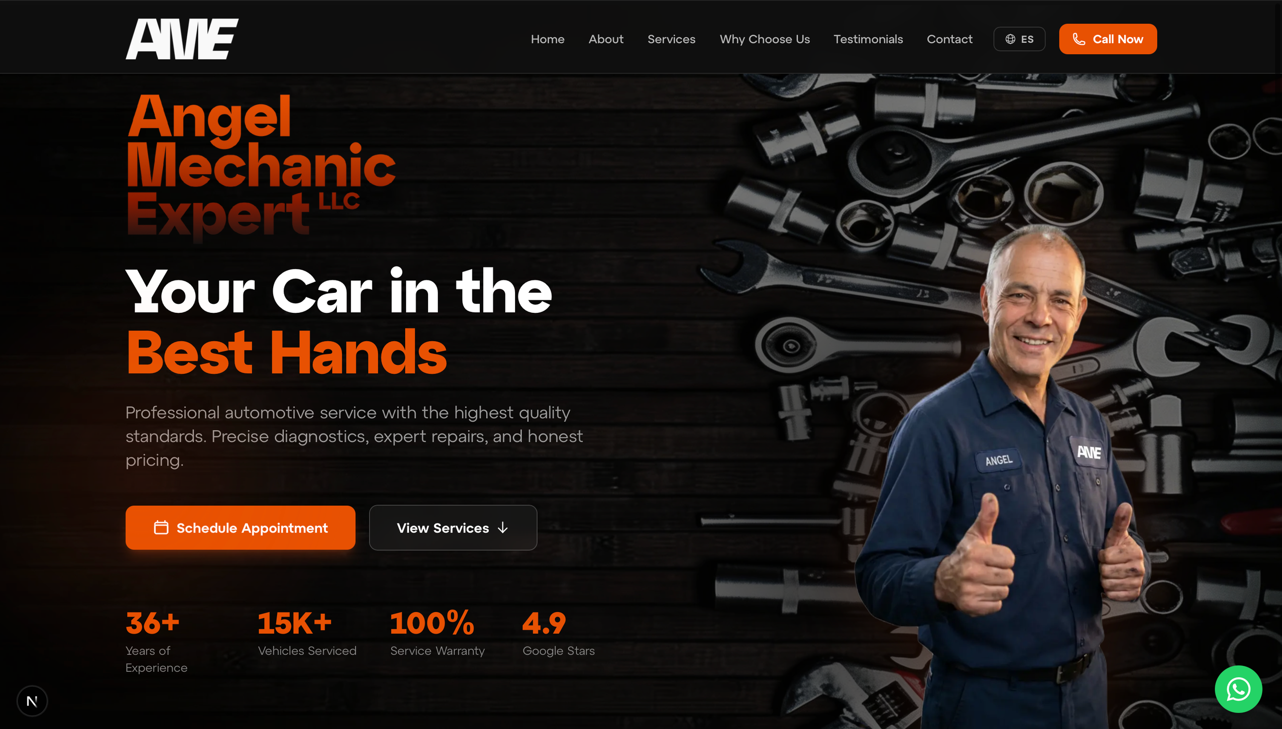 Concept design for an independent auto shop — bold persimmon accent, trust-first layout with 36+ years of experience front and center, and a bilingual service flow.