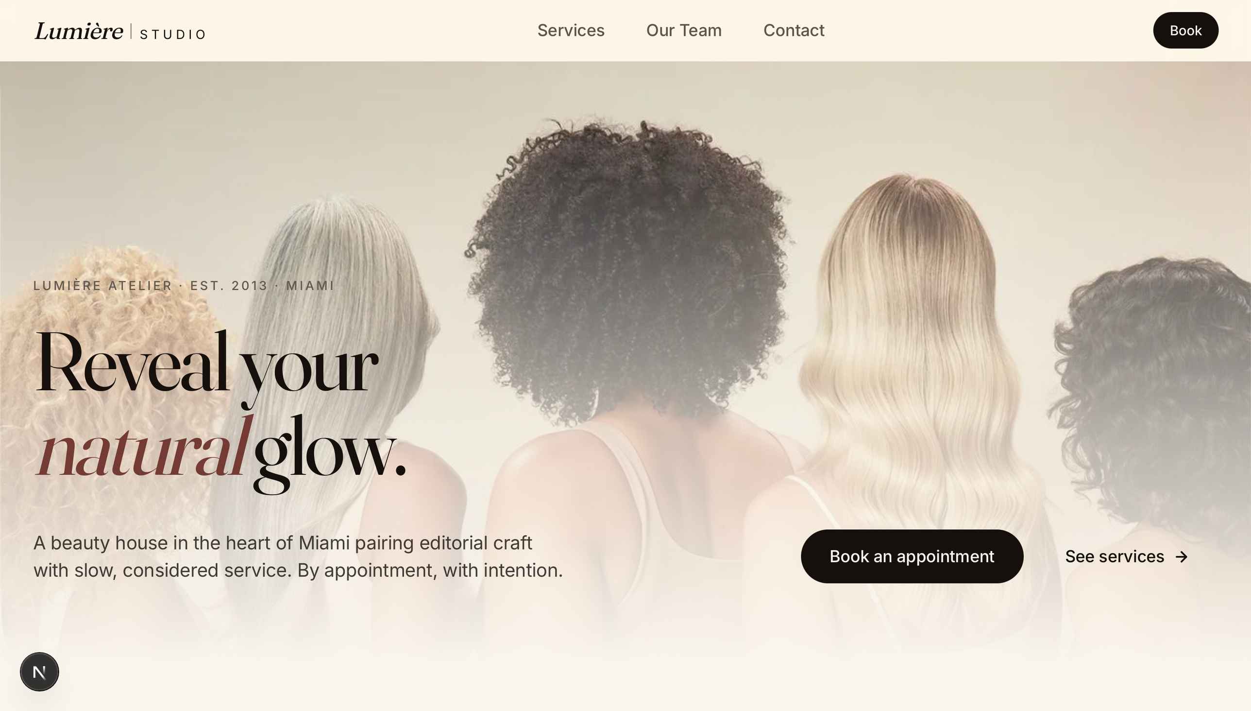 Concept design for a Miami beauty atelier — editorial serif typography, slow considered pacing, and a listening-first experience that reads premium without being cold.