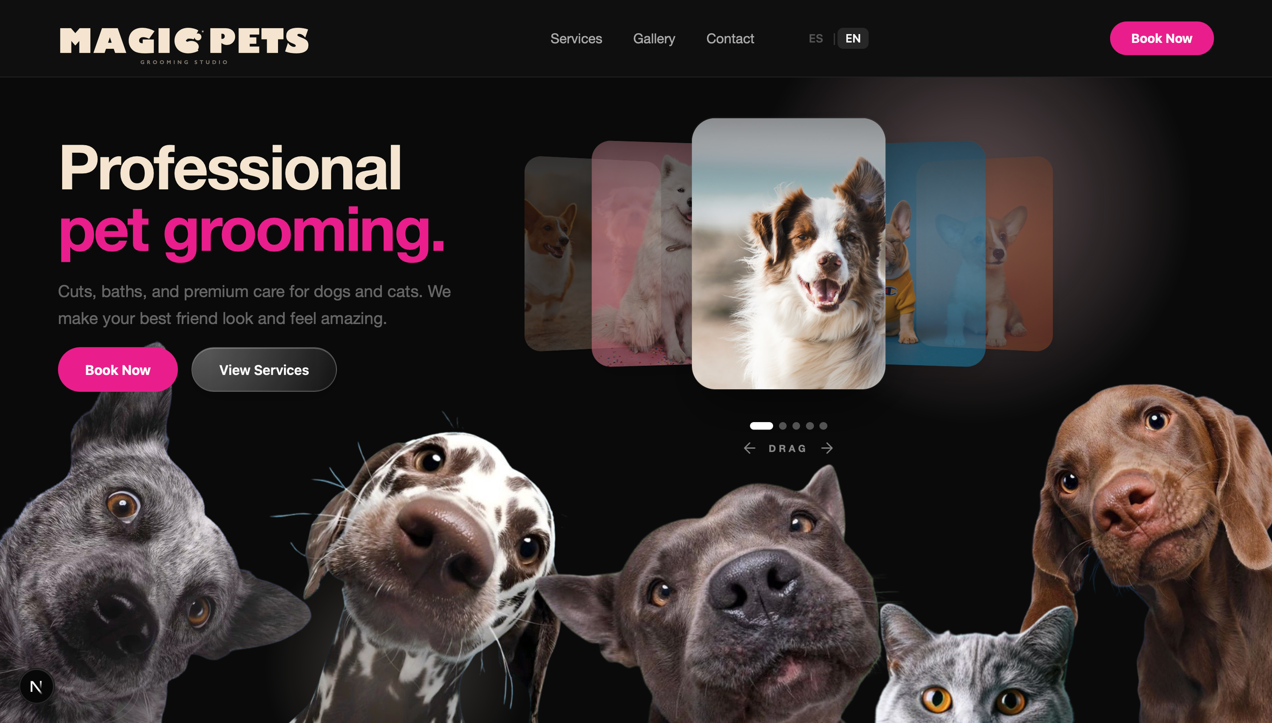 Concept design for a premium pet grooming studio — bilingual layout, drag-to-discover hero, and a playful character-driven visual system.